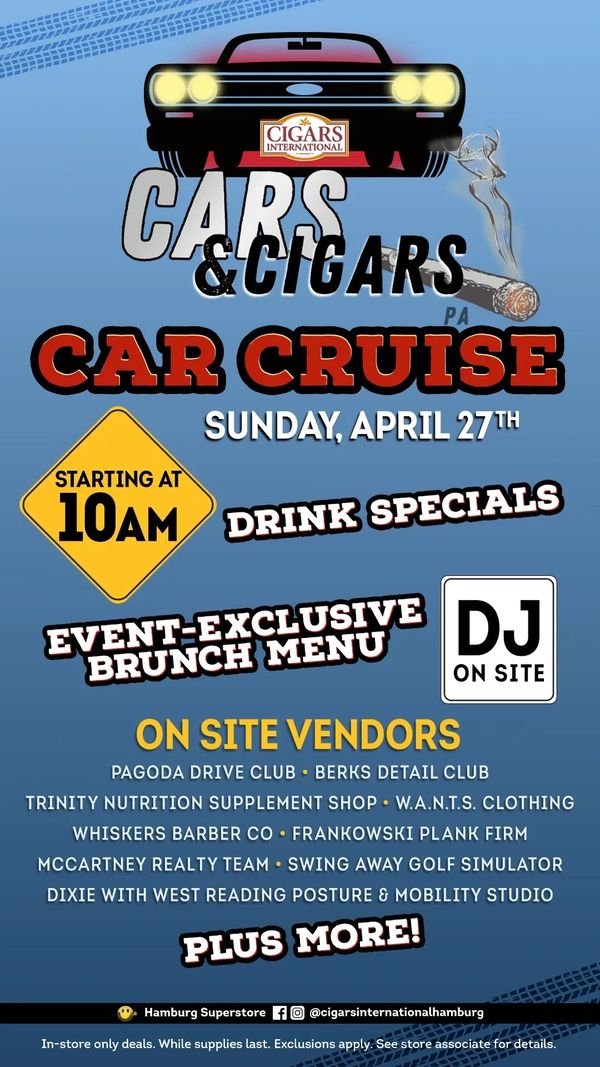 Join us on April 27th, 2025 at Cigars International in Hamburg, PA for a Cars and Cigars event that can't be missed! Email for more details below!